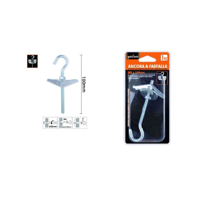 Ancora a farfalla con gancio, sistema adatto al fissaggio di carichi su laterizio forato, calcestruzzo con anima alveolare, pannelli in lastre di gesso rivestito o di gessofibra. L'ancora a farfalla è prodotta in acciaio, materiale che consente un'ottima resistenza alla ossidazione ostacolando il formarsi della ruggine.Confezione: 1 PzMisura M8x100mm