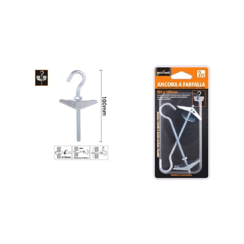 Ancora a farfalla con gancio, sistema adatto al fissaggio di carichi su laterizio forato, calcestruzzo con anima alveolare, pannelli in lastre di gesso rivestito o di gessofibra. L'ancora a farfalla è prodotta in acciaio, materiale che consente un'ottima resistenza alla ossidazione ostacolando il formarsi della ruggine.Confezione: 2 PzMisura M4x100mm