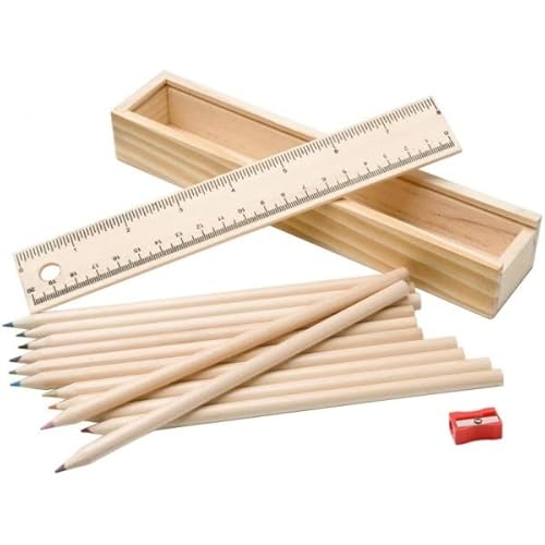 TrAdE Shop Traesio- Astuccio in Legno con 12 PASTELLI Colorati TEMPERINO Righello Riga PORTAPASTELLI