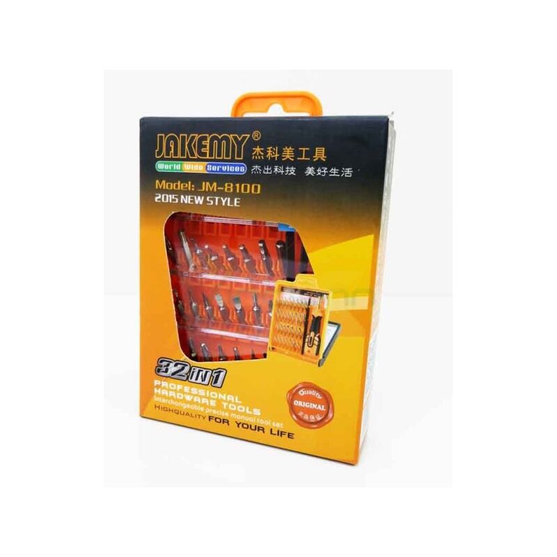 Kit professionale Jakemy JM-8100 di 32 strumenti per il montaggio, lo smontaggio e la riparazione dell'hardware. Ideale per tutti gli amanti delle modifiche ai PC e per gli elettricisti. La confezione include: Una impugnatura cacciavite anti-scivolo manicoUn paio di pinzette anti-staticheCacciaviti: Torx T3, T4, T5, T6, T7, T8, T9, T10, T15, T20 Esagonale H1.3, H1.5, H2.0, H2.5, H3.0, H4.0 Taglio - 1.5, 2.0, 2.5, 3.0, 3.5 Croce + 1.7, 2.0, 2.5, 3.0, 3.5 Triwing Y2.0 Triangolo 2.0 Pentalobe 0.8, U2.6