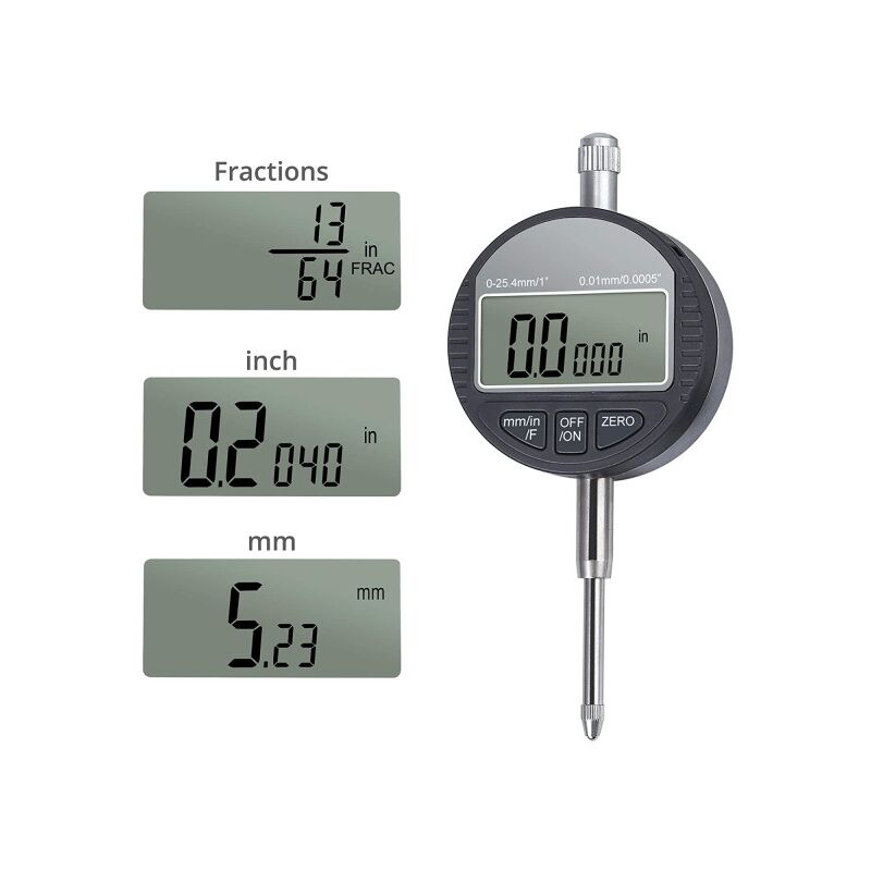 COMPARATORE CENTESIMALE DIGITALE DA 0-25,4MM-COMPARATORE CON DISPLAY DI LETTURA - TARATURA IN OGNI POSIZIONE IL TUTTO RACCHIUSO IN UN COMODO ASTUCCIOIdeale per laboratori, professionisti, industria e tanti altri settori.N.B. Base magnetica non inclusa nella confezione(LA FOTO CON ESSA E' PURAMENTE DIMOSTRATIVA AI FINI DEL SUO UTILIZZO NEI LABORATORI).CaratteristicheCommutabile da pollici a mmDiametro: 58mmCampo di misura: 0-25,4mm (0-0,5)Risoluzione: 0,01mm (0,005)Tempo di risposta: ≤0,5m/sTemperatura operativa: da 0°C a 40°CTemperatura di consevazione: da -20°C a 70°CUmidità relativa: ≤80%Azzeramento in ogni posizioneConversione mm/inchSpegnimento automatico