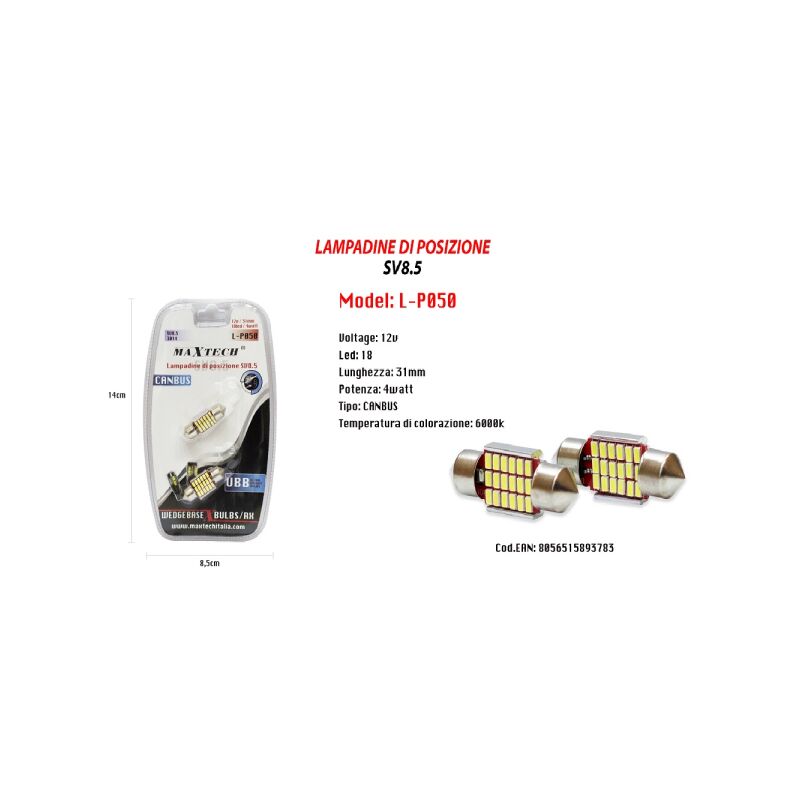 Lampadine di Posizione SV8.5 12V 18LED 31MM 4Watt MAXTECH L-P050 ULTRA LUMINOSEBenvenuti nel mondo della massima luminosità e affidabilità con le lampadine di posizione SV8.5 L-P050 12V 18LED 31MM 4Watt di MAXTECH. Se state cercando il modo perfetto per aggiornare l'illuminazione della vostra auto, avete appena trovato la soluzione ideale. Con una potenza senza rivali e una luminosità straordinaria, queste lampadine rappresentano il salto di qualità che renderà il vostro viaggio più sicuro e piacevole.Le lampadine di posizione SV8.5 12V 18LED 31MM 4Watt di MAXTECH sono progettate per offrire prestazioni eccellenti e una durata eccezionale. Con la loro tecnologia all'avanguardia, queste lampadine garantiscono una luminosità superiore e una maggiore visibilità sulla strada, migliorando la sicurezza durante la guida notturna.Caratteristiche Principali:Luminosità ultra elevata per una visibilità ottimaleDesign compatto per una facile installazioneConsumo energetico ridotto per una