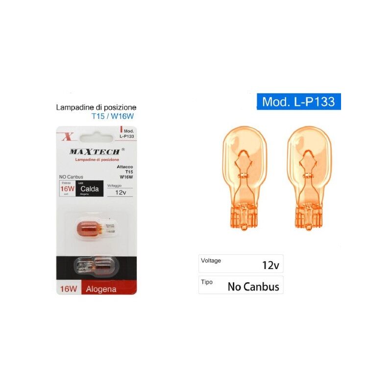 Lampadine di Posizione T15 W16W 12V Auto 16W Luce Calda Alogena - La Scelta Luminosa per la Tua AutoScopri la luminosità che cambierà il tuo modo di guidare. Le nostre Lampadine di Posizione AUTO T15 W16W 12V non sono semplici lampadine, ma un upgrade significativo per qualsiasi veicolo. Con una luce calda e accogliente, queste lampadine offrono non solo miglior visibilità ma anche un tocco di stile con il loro colore arancio unico.Perché Scegliere le Nostre Lampadine?Voltaggio ottimale: Operano a 12V, perfette per l'uso automobilistico.Potenza luminosa: 16W di pura illuminazione.Facilità di installazione: Attacco T15, per una sostituzione semplice e veloce.Qualità della luce: Luce CALDA che garantisce una visibilità superiore.Estetica migliorata: Colore arancio, per distinguersi sulla strada.Tecnologia: Alogena, per una luminosità costante.Compatibilità: Progettate per essere universali, No Canbus.Cosa Include il Pacco?2 Lampadine T15 / W16W, pronte all'uso per illuminare la tua