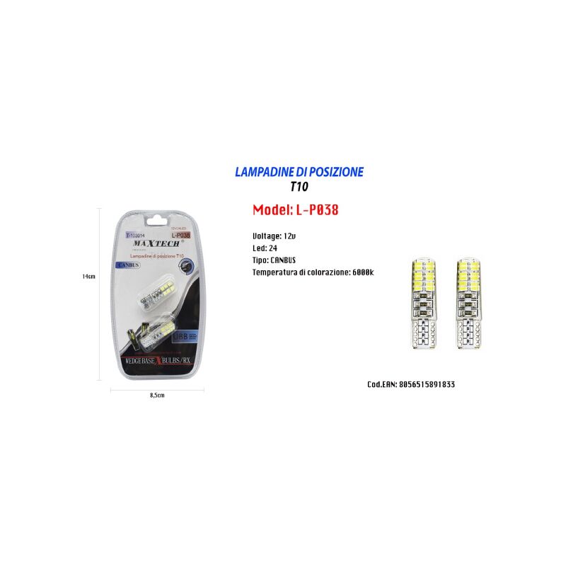 Lampadine di posizione T10 CANBUS Ultra Lum inose Maxtech L-P038 12V/24LED 6000KBenvenuto nel mondo dell'illuminazione automobilistica avanzata! Se stai cercando di migliorare l'aspetto e la visibilità della tua auto, sei nel posto giusto. Con le nostre lampadine di posizione T10 CANBUS Ultra Luminose Maxtech L-P038 12V/24LED 6000K, trasforma il tuo veicolo in un gioiello luminoso sulla strada.Caratteristiche Principali:Massima Luminosità: Le lampadine T10 L-P038 sono progettate per offrire una luminosità eccezionale, garantendo una visibilità superiore in qualsiasi condizione di guida.Tecnologia CANBUS: Grazie alla tecnologia CANBUS integrata, queste lampadine riducono al minimo il rischio di errori o avvertenze sul cruscotto della tua auto.Temperature di Colore Ottimali: Con una temperatura di colore di 6000K, le lampadine T10 L-P038 offrono una luce bianca brillante e nitida, migliorando l'estetica del tuo veicolo.Cosa sono le Lampadine di posizione T10 L-P038 12V/24LED?Le