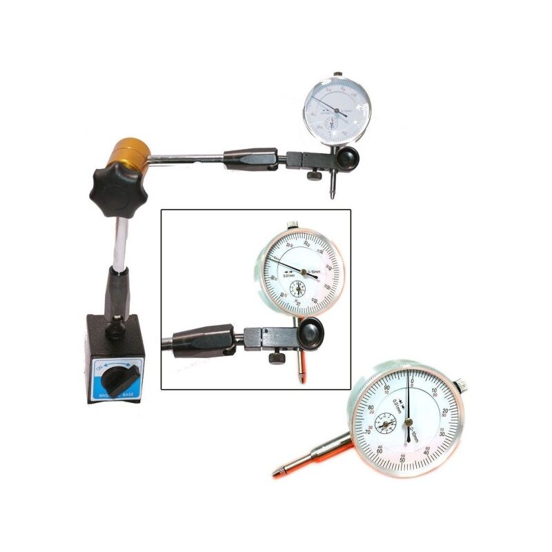 COMPARATORE CENTESIMALE E BASE MAGNETICA SNODABILE. Comparatore da 0-10 mm con risoluzione da 0,01mm. Quadrante di colore bianco e diametro da 50mm.Ideale per laboratori, professionisti, industria e tanti altri settori.Base magnetica con due superfici di appoggio rettificate, posteriore piana ed inferiore prismatica a V. Braccio snodabile dotato di sistema di blocco meccanico con regolazione fine. Il sistema di blocco consente di fissare il braccio in qualunque posizione. Ideale per comparatori con gambo da 8 mm o attacco a coda di rondine.Scheda Tecnica Base magnetica:Forza: 60 KgDimensioni base: 63 x 50 x 55h mmPeso: circa 1430 gDue superfici di appoggio rettificate di cui una piana ed una prismaticainterruttore del flusso a chiave rotantecolonna mm 180braccio mm 150aste cromatemagnete permanentedue fori per attacco del comparatore 8 mm H 7attacco per comparatori con orecchia posteriore. COMPARATOREDiametro 58mmGHIERA GIREVOLECampo di misura: 0-10mm (0-0,5)Risoluzione: 0,01mm