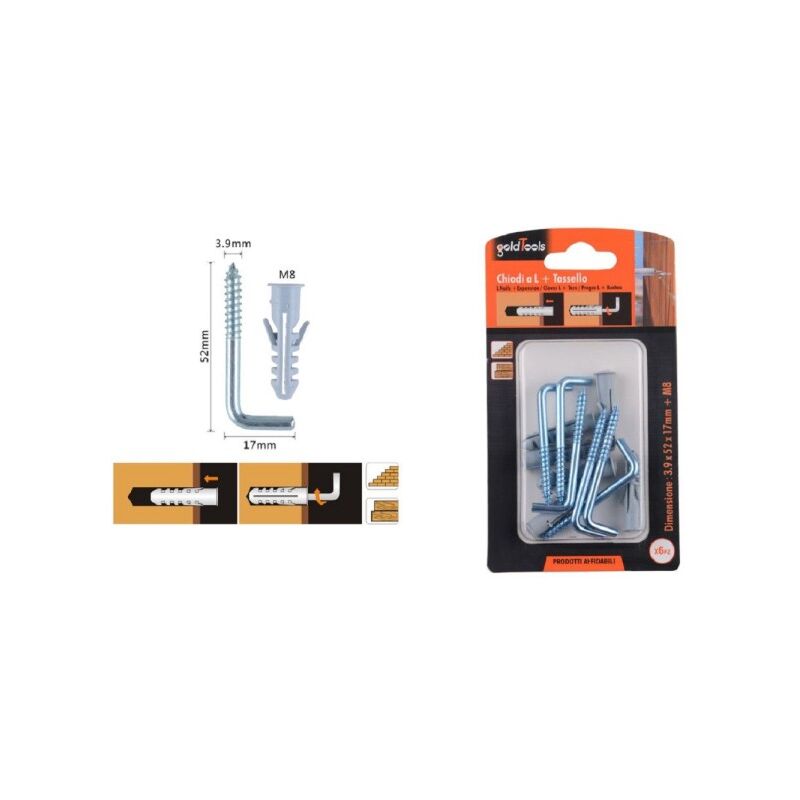SET 6 PEZZI TASSELLI M8 CON CHIODI A L 3.9x52x17mmLe alette anti-rotazione impediscono al fissaggio di girare nel foro e garantiscono un elevato livello di sicurezza nell'installazione. L'espansione necessaria alla resistenza alla trazione avviene per avvitamento dell'apposito chiodo a L che permette, con espansioni parallele alla linea del bordo, di fissare carichi anche in prossimità degli spigoli. Il tassello, per la sua geometria, si fissa in profondità nel supporto e la presenza del collarino impedisce al tassello stesso di penetrare nel foro. Le sue alette laterali non gli permettono di ruotare sul proprio asse.Misurechiodi a L 3.9x52x17mmtassello M8