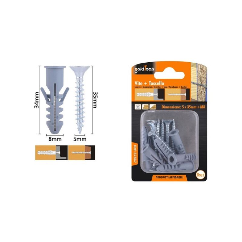 Set 8 pezzi tasselli M8 con viti ø 5x35 mmfissaggio con collare con corpo del tassello aperto e linguette antirotazione. L'espansione necessaria alla resistenza alla trazione avviene per avvitamento della apposita vite autofilettante e su due direzioni che permette, con espansioni parallele alla linea del bordo, di fissare carichi anche in prossimità degli spigoli. Il tassello, per la sua geometria, si fissa in profondità nel supporto e la presenza del collarino impedisce al tassello stesso di penetrare nel foro. Le sue alette laterali non gli permettono di ruotare sul proprio asse.Misure vite 5x35mm tassello M8 8x34mm