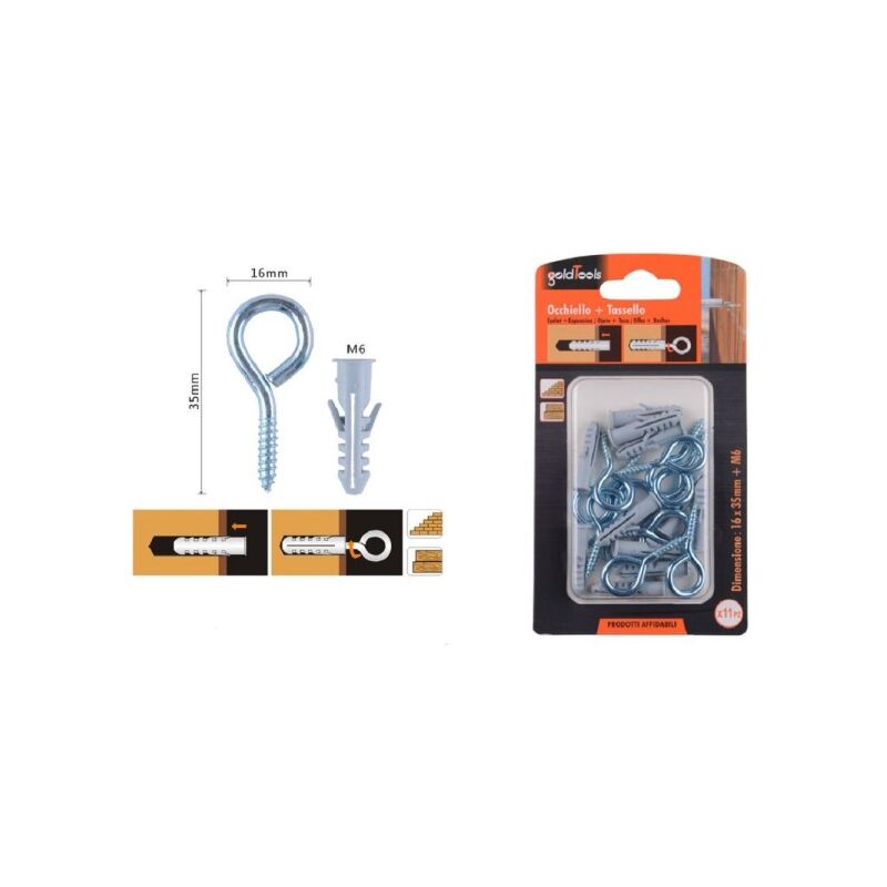 Set 11 pezzi tasselli M6 con viti a occhiello chiuso 16x35mmLe alette anti-rotazione impediscono al fissaggio di girare nel foro e garantiscono un elevato livello di sicurezza nell'installazione. L'espansione necessaria alla resistenza alla trazione avviene per avvitamento della apposita vite a gancio con occhiello chiuso che permette, con espansioni parallele alla linea del bordo, di fissare carichi anche in prossimità degli spigoli. Il tassello, per la sua geometria, si fissa in profondità nel supporto e la presenza del collarino impedisce al tassello stesso di penetrare nel foro. Le sue alette laterali non gli permettono di ruotare sul proprio asse.Misure vite a gancio 16x35mm tassello M6