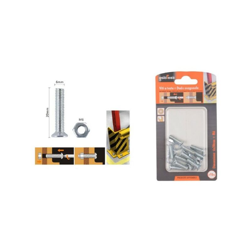 Set 10 Pezzi Viti Vite a Testa a Croce Piatte 6x20mm con Dado Esagonale M6 90943Se sei alla ricerca di viti affidabili e di alta qualità per i tuoi progetti, il nostro set di 10 pezzi di viti con testa a croce piatta e dadi esagonali è la soluzione ideale. Progettate per offrire prestazioni superiori e durature, queste viti sono perfette per una vasta gamma di applicazioni industriali e fai-da-te.Caratteristiche Tecniche:Testa Piatta a Croce: La testa a croce offre una maggiore facilità di fissaggio, consentendoti di serrare le viti con precisione e sicurezza.Dimensioni Vite: Con un diametro di 6 mm e una lunghezza di 20 mm, queste viti sono progettate per adattarsi perfettamente alle tue esigenze di fissaggio.Dimensioni Dado M6: Il dado esagonale M6 offre una maggiore stabilità e resistenza, garantendo che le viti rimangano saldamente in posizione anche sotto stress.Confezione da 10 Pezzi:Ogni confezione contiene 10 viti di alta qualità, sufficienti per affrontare una vasta gamma di