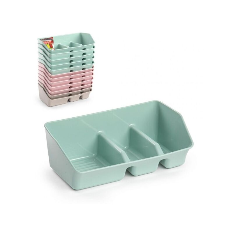 Contenitore rettangolare diviso in tre vani per alloggiare spugne di varie dimensioni. Appoggiato sul lavandino consente di tenerlo in ordine e allo stesso tempo di avere le spugne immediatamente disponibili. Disponibile in diverse variazioni di colore.Composizione: Plastican.b. Il colore verra' inviato a seconda della disponibilità di magazzino