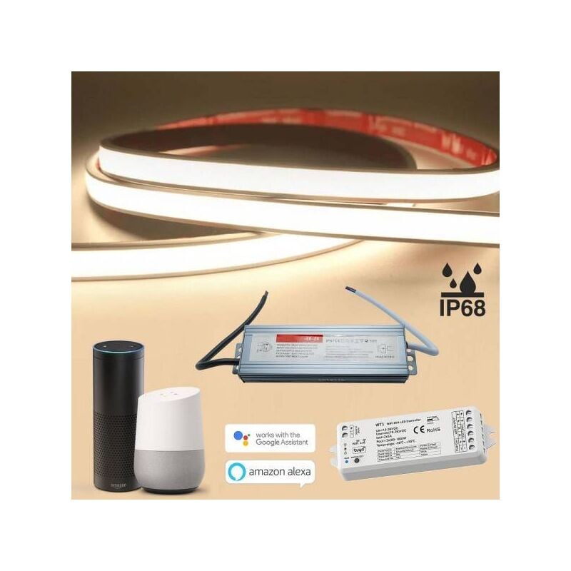 Kit Smart Completo Di 1 Striscia Linear Cob Flex Led High Performance Superior Quality Dimmable 24vac Dc Stagna Ip68 Neon Flex, 1 Centralina Smart Compatibile Con Amazon Alexa E Google Home, 1 Alimentatore Led 60w A 24v Ideale Per L'illuminazione E La Decorazione Di Ambienti Con Presenza Di Umidità Ed Acqua Come Box Doccia, Saune, Bagno Turco E Tutti Gli Ambienti Con Presenza Di Acqua Ed Umidità. Prodotto Progettato Per Esterni Ed Interni Resistente Agli Agenti Atmosferici Può Lavorare Anche Ad Immersione. Questo Prodotto è Dotato Di Una Particolare Guaina Protettiva In Silicone Flex E Si Adatta A Qualsiaisi Applicazione Per Illuminare Gli Esterni Creando Una Luce Lineare Grazie Al Nuovo Concetto Di Chip Linear Cob Neon Flex.consumo Energetico Di Appena 45w 9w/m è Dotata Di 2400 Led Cob Su Di Un Circuto Pcb Ip68 Altamente Flessibile Ed Applicabile Su Qualsiaisi Superfice O Ambiente.si Alimenta A Bassa Tensione A 24v Tramite Alimentatore. La Striscia è Dimmerabile Tramite Dimmer
