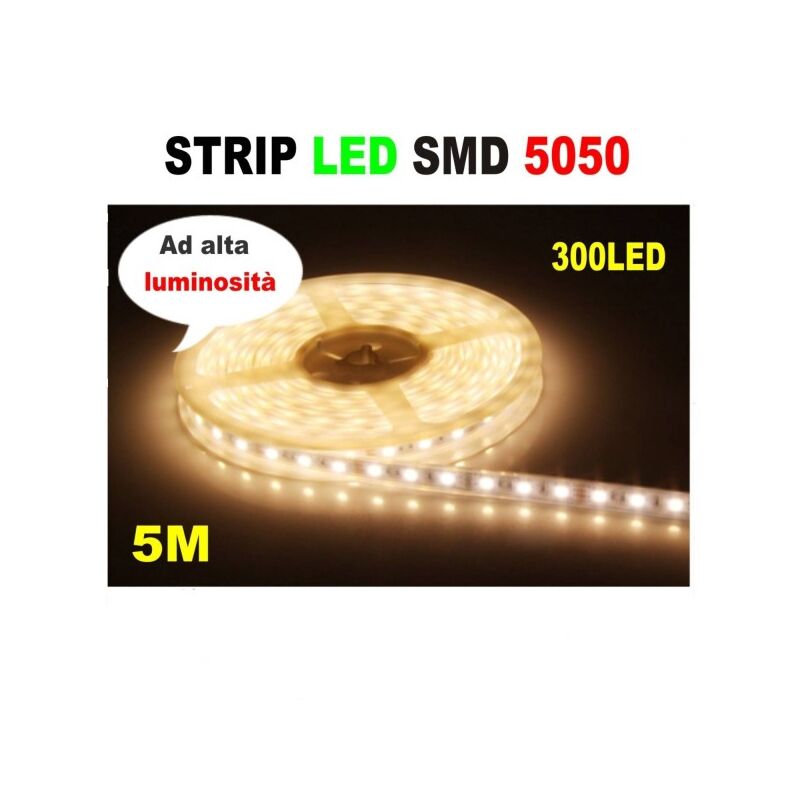 Strip Led Di 5 M Bianco Caldo Per Uso Interno Ed Esterno Adatto All'illuminazione Di Ambienti. La Strip Led è Un Prodotto Molto Versatile Grazie Alla Sua Flessibilità E Alla Possibilità Di Essere Tagliata A Misura (ogni 3 Led) Risulta Particolarmente Adatta Per L'illuminazione Di Vetrine, Pareti (ad Esempio Come Luce Riflessa Nel Controsoffitto), Mensole, All'interno Di Armadi O Lungo Le Scale. Un'ottima Soluzione In Caso Di Retroilluminazione Di Televisori Oppure Come Luce Di Cortesia. Molto Utilizzate Anche Nell'ambito Pubblicitario All'interno Di Pannelli Luminosi O Espositori. Questa Strip Ha Una Dimensione Molto Contenuta (12 X 4 Mm) Ma Produce Una Luminosità Pari A 1500 Lumen, Come Una Lampada Ad Incandescenza Di 150 Watt. Oltre A Permettere Un Grande Risparmio Energetico La Strip Led Ha Anche Una Lunga Durata (fino A 30.000 Ore Di Funzionamento) E Un Tempo Di Accensione Immediato Rispetto Alle Lampade A Fluorescenza. La Strip Led Ha 300 Led Smd 5050 Su 5 M Ed è Dotata Di