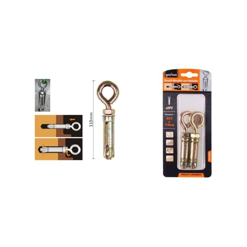 Set 2 pezzi tasselli metallici con occhielloQuesto fornisce un fissaggio resistente a carichi elevati nei mattoni pieni e nel calcestruzzo. Utilizza la coppia per aumentare la resistenza del raccordo con la forza di rotazione. Il design dell'ancoraggio con schermatura a bullone allentato utilizza una testa a occhiello, che consente all'acciaio di sopportare sollecitazioni elevate.Caratteristiche dimensione M10x110mm