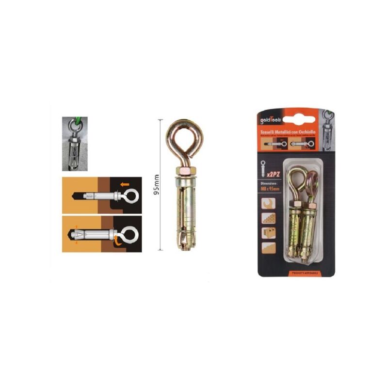 Set 2 pezzi tasselli metallici con occhielloQuesto fornisce un fissaggio resistente a carichi elevati nei mattoni pieni e nel calcestruzzo. Utilizza la coppia per aumentare la resistenza del raccordo con la forza di rotazione. Il design dell'ancoraggio con schermatura a bullone allentato utilizza una testa a occhiello, che consente all'acciaio di sopportare sollecitazioni elevate.Caratteristiche dimensione M8x95mm