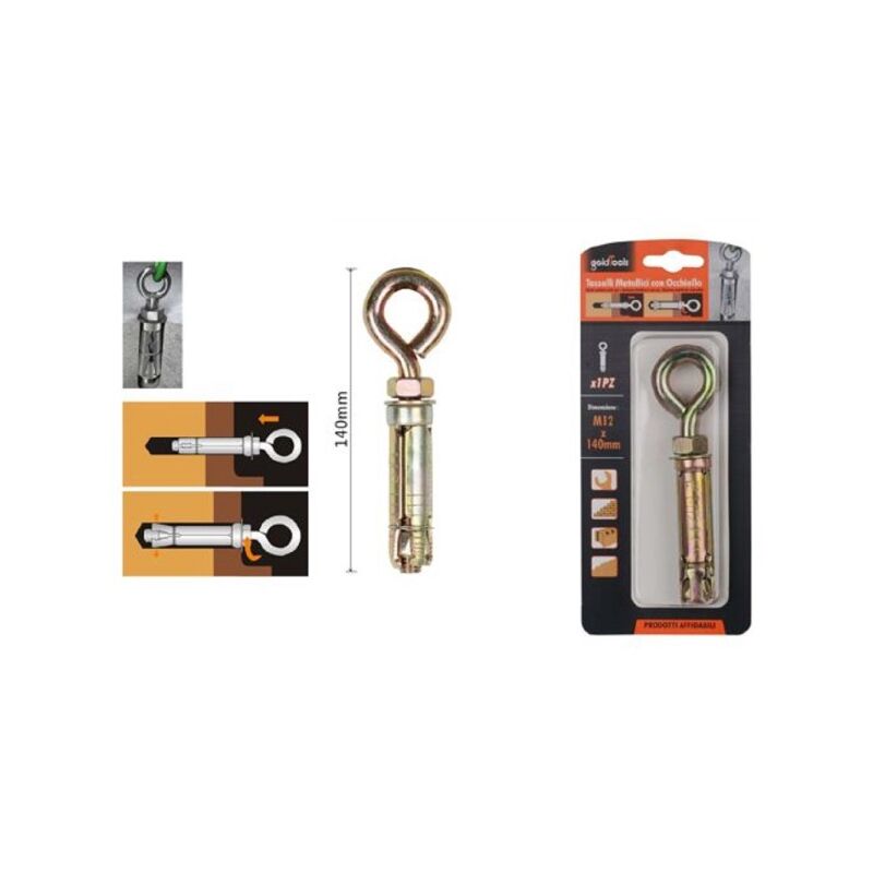 Set tassello tasselli metallici con occhielloQuesto fornisce un fissaggio resistente a carichi elevati nei mattoni pieni e nel calcestruzzo. Utilizza la coppia per aumentare la resistenza del raccordo con la forza di rotazione. Il design dell'ancoraggio con schermatura a bullone allentato utilizza una testa a occhiello, che consente all'acciaio di sopportare sollecitazioni elevate.Caratteristiche dimensione M12x140mm