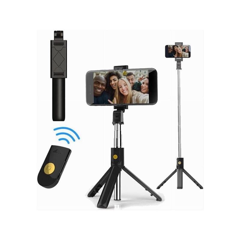TREPPIEDE 3IN1 SELFIE STICK BLUETOOTH ASTA ESTENSIBILE CON TELECOMANDO PORTATILEIl Tripod 3 in 1 Selfie Stick con Bluetooth è un accessorio versatile e pratico, ideale per catturare momenti speciali sia all'interno che all'esterno. Grazie alla sua funzionalità 3 in 1, questo selfie stick si adatta alle tue esigenze di scatto, offrendo la possibilità di utilizzarlo come bastone per selfie o come treppiede per foto e video.Caratteristiche principali:Bluetooth integrato: Il selfie stick è dotato di un telecomando Bluetooth che ti consente di scattare foto a distanza con facilità. Basta accendere il telecomando, cercare il dispositivo Bluetooth BT Selfie Stick sul tuo smartphone e connetterlo per iniziare a utilizzare il dispositivo.Lunghezza regolabile: La lunghezza del bastone per selfie è regolabile da 19,5 cm a 70 cm, consentendoti di catturare scatti da diverse angolazioni e prospettive. Inoltre, il supporto per telefono è dotato di una funzione girevole a 270° per garantirti il