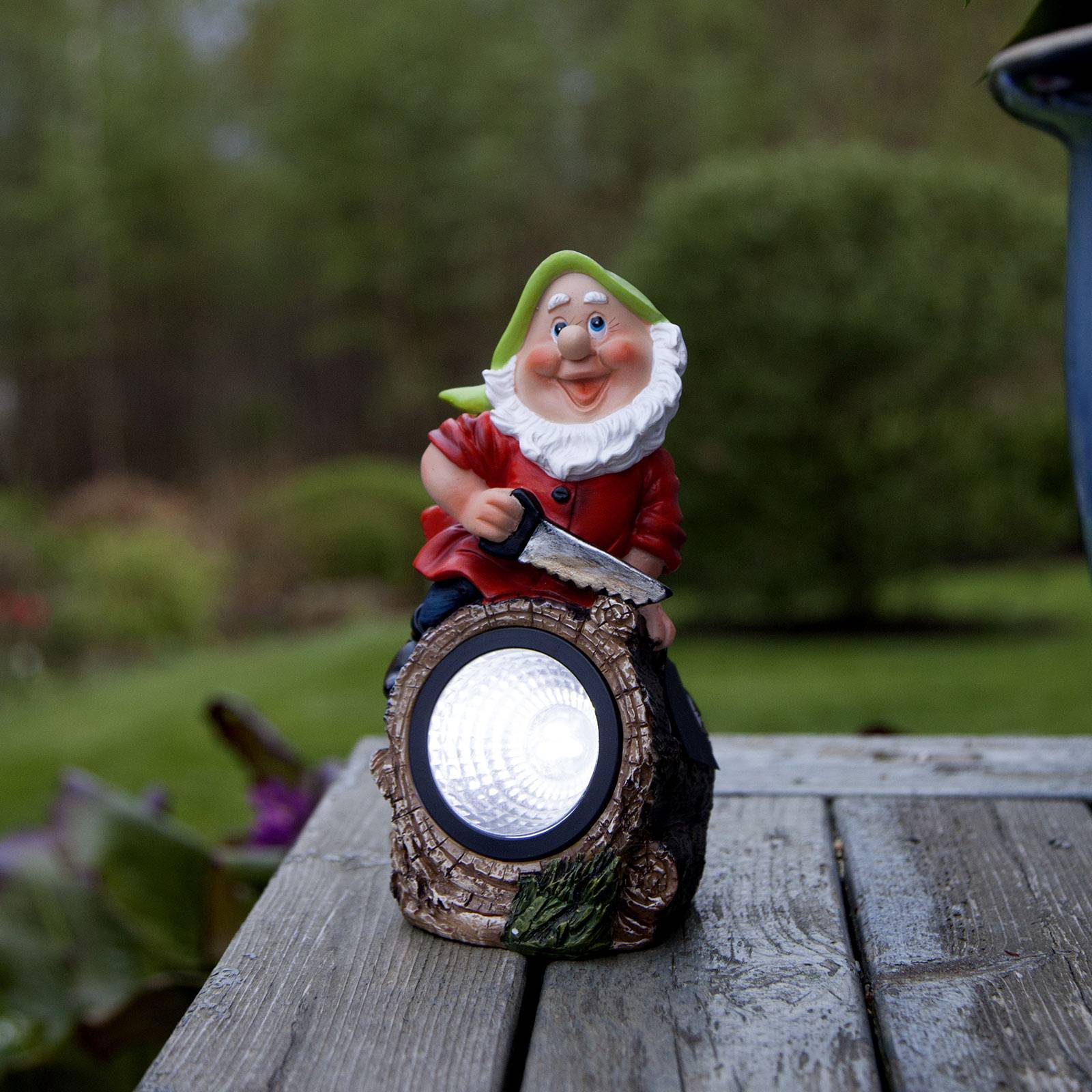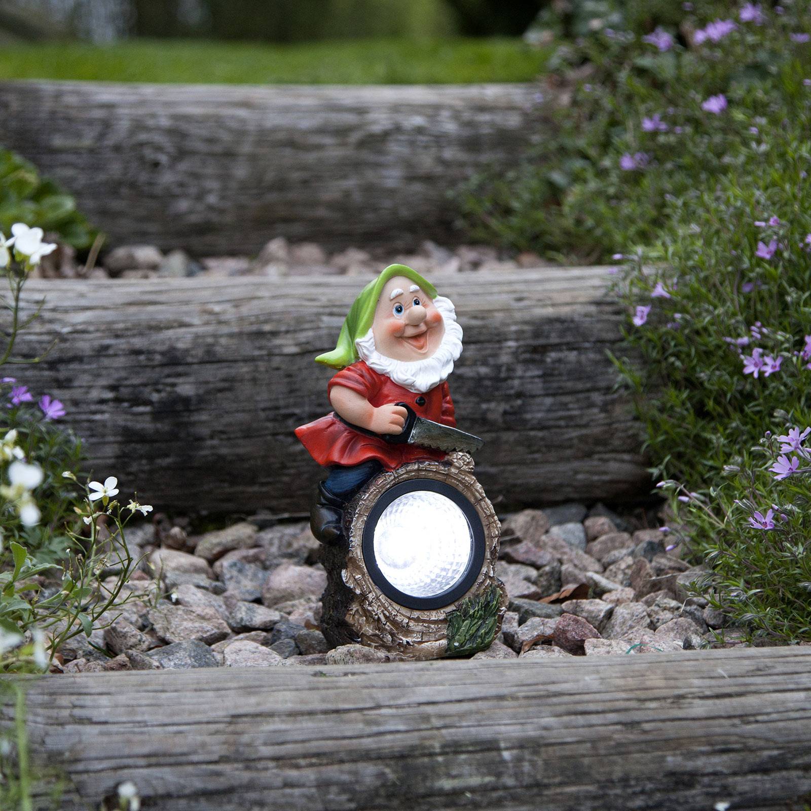 Lampada solare LED Gnomy a forma di taglialegna con sega e tronco La lampada solare LED Gnomy è un allegro gnomo da giardino che tiene in mano una sega e sembra in procinto di tagliare il tronco su cui sta seduto. Nel tronco è inserita una lampada LED che si accende con un interruttore crepuscolare mettendo in scena lo gnomo. Di giorno il modulo solare integrato ricarica la batteria. A carica completa, la batteria tiene accesa la luce per sei ore. Questa lampada decorativa costituisce un bel colpo d'occhio in giardino. Grazie al modulo solare e alla batteria ricaricabile non ha bisogno di alcun collegamento esterno.