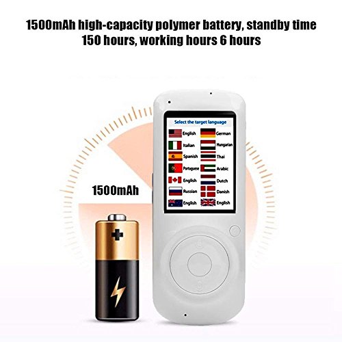Riconoscimento ad alta capacità - -- questo dispositivo translator è altamente sensibile e preciso nel suo riconoscimento di uno dei suoi 32 lingue incluse. In aggiunta, lo speaker voice è forte e chiaro, e il microfono è in grado di riconoscere la voce anche in ambienti rumorosi, batteria 1500 mAh con 8 giorni di standby e 8 ore di tempo di funzionamento. Compatto e facilmente trasportabile: tenere su un cordino per un accesso rapido o riporre in tasca.
