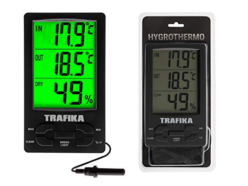 TRAFIKA Termometro con Igrometro speciale per Coltura Interna con sonda di 2.5m / Schermo LED Verde Grande / Armadio Cultivo Indoor / Misuratore temperatura e umidità