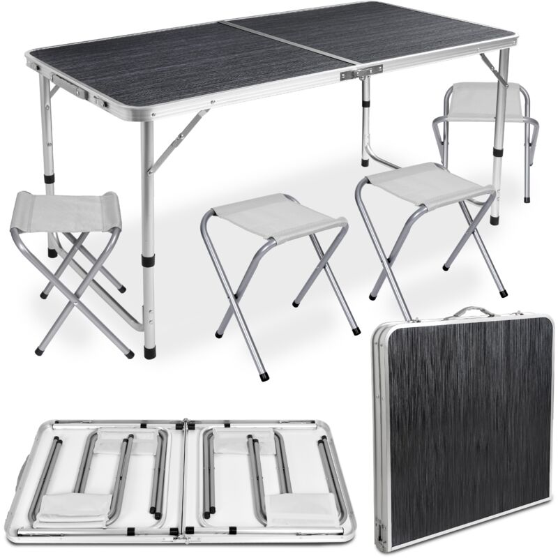 TRAMP set turistico da campeggio pieghevole 120x60 cm legno nero Dimensioni: 120 x 60 cm | Colori: legno nero| Modello: Trip ⭐Fino a 3 livelli di regolazione dell'altezza! Il set da campeggio turistico TRIP è composto da un tavolo e quattro sedie. Il set si apre comodamente e si ripiega in una valigia. Una comoda maniglia aiuta nel trasporto. Il tavolo è regolabile in altezza, il piano può essere regolato a tre altezze. Il telaio TRIP è realizzato in alluminio di alta qualità, il che lo rende molto leggero. Il piano del tavolo è realizzato in resistente pannello MDF. Questa combinazione di materiali garantisce un peso ridotto, facilitando il trasporto del set. Assemblare il tavolo e le sedie è molto semplice. Il tavolo è dotato di una maniglia che ne consente un comodo trasporto. Caratteristiche del prodotto: materiale del piano del tavolo: MDF colore del piano del tavolo: materiale del telaio del tavolo in legno nero: materiale del telaio della sedia in alluminio: materiale del