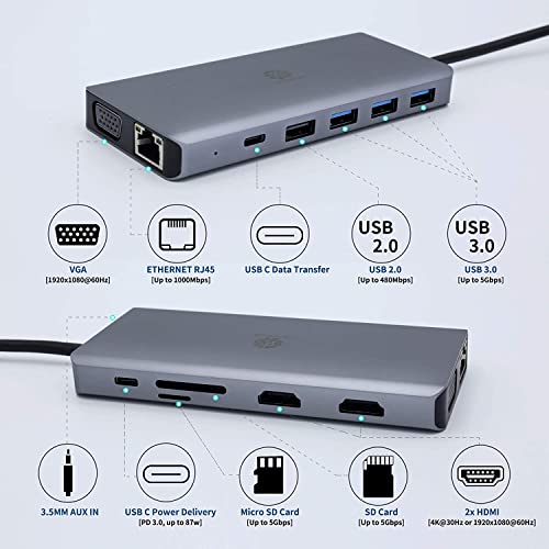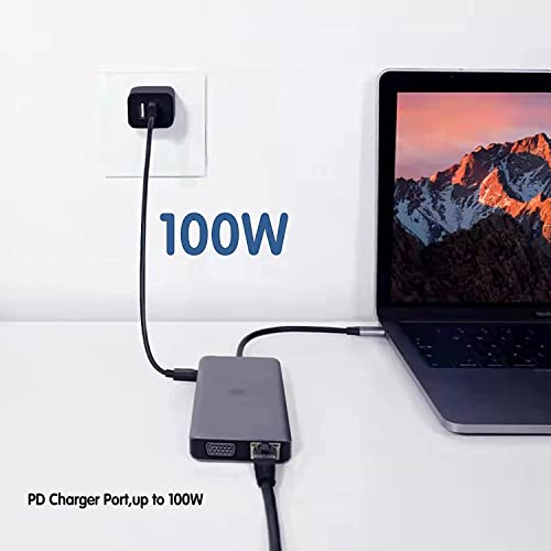 TRANSLON USB C Hub, docking station compatta, 13 in 1, triplo display, PD 100W, 2X HDMI, 1x VGA, 4X USB, 1x extra tipo C USB, lettore di schede SD/microSD, LAN Ethernet, 3,5 mm presa da