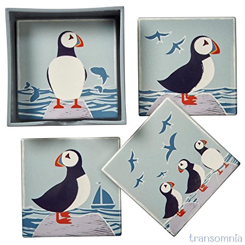 Ogni sottobicchiere ha un design diverso, ognuno con puffin