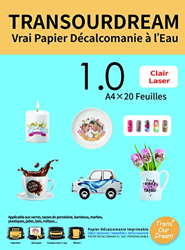 TransOurDream Formato A4 x 20 fogli Carta Dimmersione per oggetti trasparenti e chiari, Stampante Laser, Carta Trasferimento ad acqua 1.0, adesivi, stampabile, personalizzabile, FR-8-20