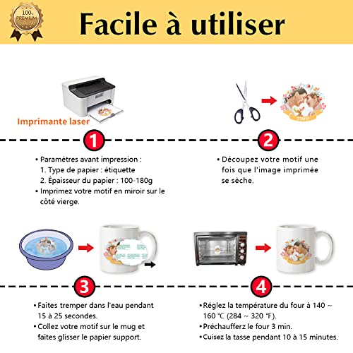 DE PETITS REMARQUES: a. La nostra carta trasparente funziona per stampanti laser e per oggetti chiari. b. Gli oggetti che non possono essere messi in forno possono essere asciugati all'aria aperta, come candele o vasi grandi. C. Non avete bisogno di vernice lucida per questo prodotto, è super facile da usare
