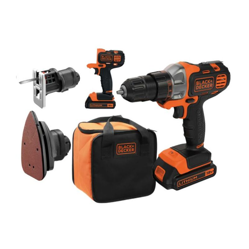 Potenza 18 Volt - 1,5 Ah, batteria Litio, velocita' variabile 0-800 giri/min., reversibile, mandrino autoserrante 10 mm., regolazione di coppia di serraggio 10 + foratura, torsione 21 Nm, luce Led integrata, tempo di ricarica 3/5 ore. Dotazione: Testa trapano avvitatore, seghetto e levigatrice, caricabatteria, Softbag rigida