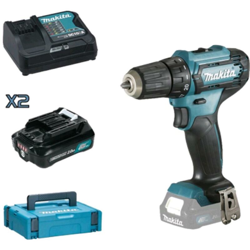 Mandrino autoserrante da Mm. 10. Reversibile. Due velocita' meccaniche da: Giri/Min. 0-450 e Giri/Min. 0-1.700. Coppia massima Nm. 28. LED di illuminazione e freno elettrico. Ingranaggi in metallo. Foratura: metallo Mm. 10, legno Mm. 21. In dotazione: 2 batterie al litio 12V 2,0Ah (compatibile anche con tecnologia della serie 10,8V) caricabatteria e valigetta MAKPAC. Peso: Kg. 1,1.