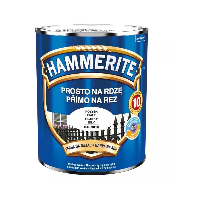 Dati tecnici Produttore: Hammerite Codice produttore: 44456 EAN: 5011867046754 Capacità: 0,7 l Colore: bianco Smalto Hammerite bianco lucido 0,7 l Hammerite Straight to Rust è una vernice moderna, monocomponente, che asciuga all'aria e destinata alla protezione dalla corrosione e alla pittura decorativa realizzata da metalli ferrosi (sia arrugginiti che puliti). **Le immagini sono solo a scopo illustrativo