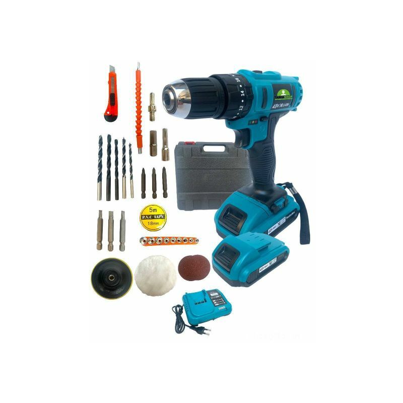 Trapano avvitatore doppia batteria litio 48V ricaricabile cordless con valigetta portatile è accessori Tapano avvaitatore a batteria, dotato di una selezione di ingranaggi con velocità variabile. Ideale per un ampia gamma di applicazioni. Il trapano ha una impugnatura ergonomica con impugnatura morbida gommata, che offre una presa confortevole e un maggiore controllo, riducendo al minimo l'affaticamento e il dolore della mano. Specifiche tecniche: Utilizza batterie da 48V. (nr.2 pz in valigetta) 2 Velocità Chuck: 10mm senza chiave a innesto. Variazioni impatti: 1-25 Potenza: 48V MAX Doppia batteria 2.0Ah RPM: 2 Velocità (0-450 / 0-1700) Contenuto della confezione: Nr. 1 Trapano avvitatore Nr. 1 Caricabatterie Nr. 2 Batterie a litio Nr. 24 Accessori -Manuale di istruzioni in inglese Nr.1 valigetta portatile