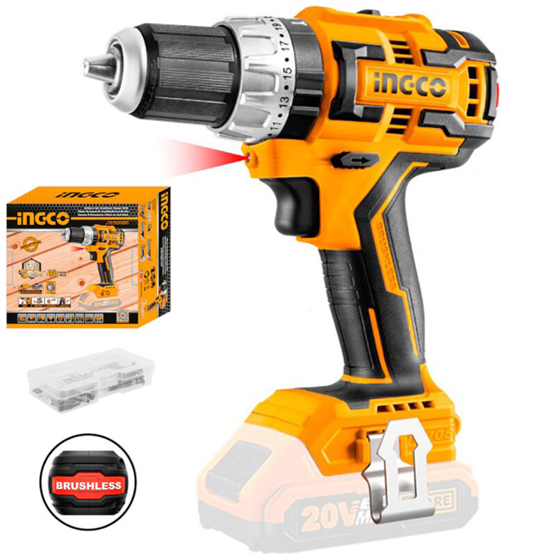 Ingco CIDLI206081 è un trapano avvitatore a percussione a batteria 20 V Brushless venduto in versione Solo senza accessori di alimentazione ma con 47 accessori tra punte, viti e inserti. Il potente motore a 20 V è brushless (senza spazzole), il che ne aumenta affidabilità e durata. Questo trapano fa parte della grande serie P20S dell Ingco. Questo indica che con la stessa serie di accessori (batterie e caricabatterie) possono essere alimentati decine di strumenti compatibili. Specifiche: Motore senza spazzole Tensione: 20 V Velocità a vuoto: 0-450 / 0-1900 rpm Max.percussione:22500/min Coppia massima: 60 NM Capacità del mandrino: Ø 2-13 mm Impostazione regolazione di coppia: 23 + 1 + 1 Cambio meccanico a 2 velocità Volt di carica: 220V-240V~50/60Hz Luce di lavoro integrata Indicatore LED di carica batteria Accessori 47 pz Peso trapano senza batteria: 1.15 Kg Peso trapano con batteria 2 ah: 1.58 Kg (non inclusa) Lunghezza trapano: 19 cm Profondità trapano: 6 cm Altezza trapano (senza