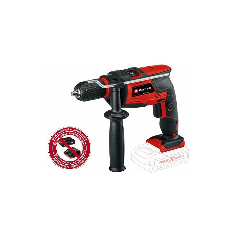 CARATTERISTICHE Il trapano a percussione a batteria Einhell TC-ID 18 Li - Solo è un membro ad alta potenza della famiglia flessibile Power X-Change. Ogni batteria ricaricabile PXC può essere abbinata a qualsiasi altro dispositivo della serie. Con le sue due funzioni, il trapano a percussione a batteria è uno strumento potente che aiuta i principianti e gli appassionati di fai da te esperti durante la perforazione nel materiale appropriato. L'interruttore con il blocco a funzionamento continuo consente di praticare fori anche in materiali tenaci. La regolazione elettronica della velocità consente l'adattamento al materiale e all'applicazione specifici qualunque sia il livello di potenza del trapano a percussione. L'arresto della profondità di foratura regolabile in metallo impedisce che i fori vengano realizzati troppo in profondità. La funzione di rotazionereversibile supporta l'avvitamento, mentre il mandrino autoserrante da 13 mm facilita il cambio degli utensili. L'impugnatura