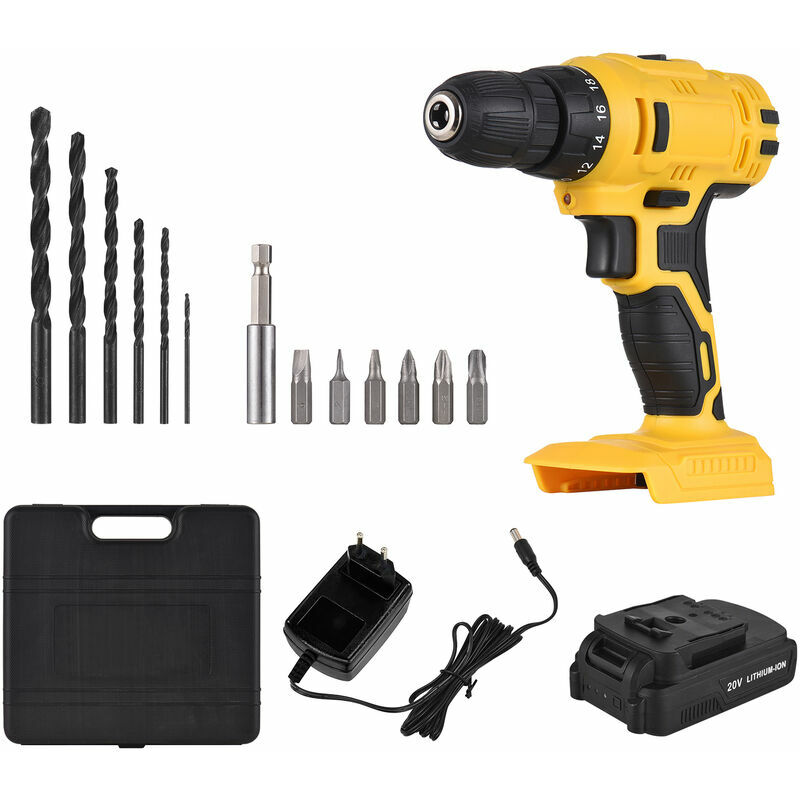 Il trapano elettrico portatile con batteria ricaricabile 20V 1300mAh e caricatore rapido è un pratico strumento per forare. È facile da usare e portatile da trasportare e può essere applicato alla ricostruzione domestica, al fai-da-te, alla lavorazione del legno, al giardinaggio, alla riparazione di automobili e altro! Nota: Le dimensioni e il colore possono essere leggermente diversi a causa della misurazione manuale e delle diverse condizioni di illuminazione, si prega di prevalere in natura. Grazie. Specifiche: Caricabatterie: spina europea/spina americana (opzionale) Colore: giallo Materiale: ABS Diametro del mandrino: 10 mm (3/8") Velocità a vuoto: 0- 400 giri/min/0-1500 giri/min Velocità: 2 impostazioni di velocità variabili Impostazione della coppia: 18+1 Coppia massima: 28 Nm Capacità di foratura: metallo 10 mm, legno 20 mm Batteria: batteria al litio 20 V 1300 mAh Lampada da lavoro LED: sì Dimensioni confezione: 42 * 21 * 10 cm / 16,54 * 8,27 * 3,94 pollici /b> 1 * Trapano