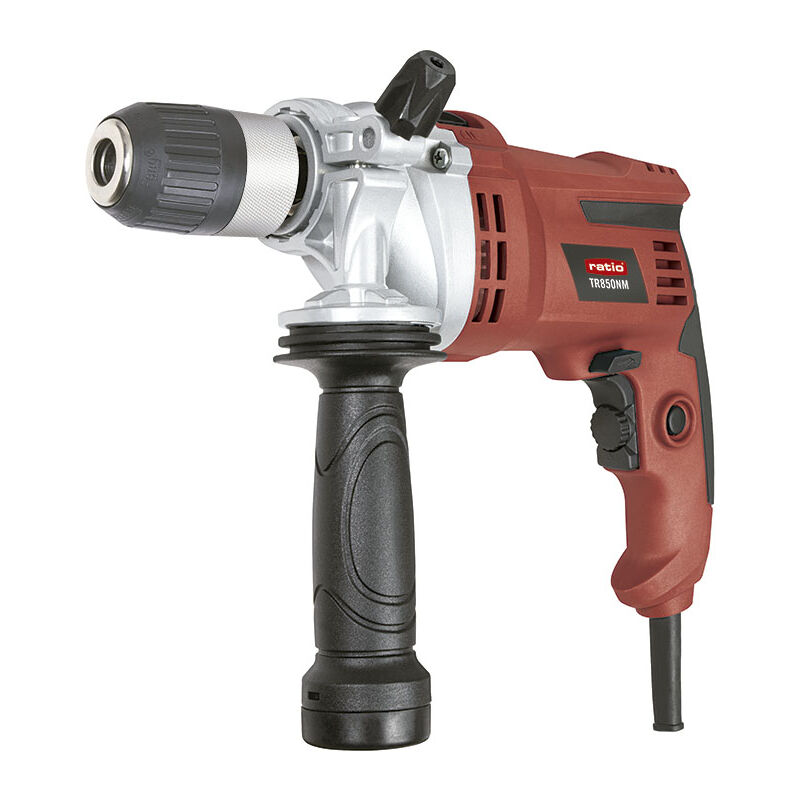Elettronico-reversibile. Mandrino automatico 13 mm. Manico bimateriale. Custodia per il trasporto con 12 accessori, maniglia ausiliaria e arresto di profondità. Potenza: 850 W.rpm:0-3.000. MPI: 0-48.800. Punta in acciaio max. 13 mm. Punta per legno massima 40 mm. Punta per calcestruzzo 16 mm. Peso: 2.42 kg