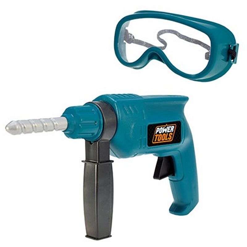 Trapano per utensili elettrici con occhiali di sicurezza. Quando si preme il pulsante per iniziare a perforare, il trapano gira senza batterie. Adatto a bambini dai 3 anni.