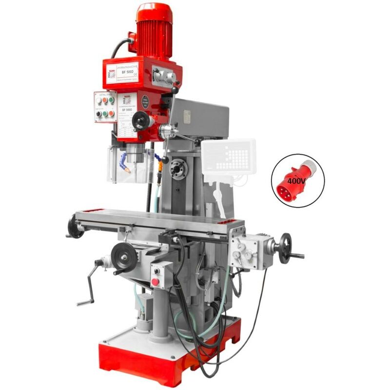 ATTENZIONE: SENZA VISUALIZZATORE DIGITALE! La fresatrice universale Holzmann BF500D è costruIita in ghisa robusta, in grado di assorbire le vibrazioni e di garantire un'ottima precisione durante l'utilizzo. Testa di fresatura orientabile (+ 90 ° -90 °) ad ingranaggi. Rotazione a sinistra e a destra. Scatole ingranaggi a bagno d'olio. Max. attacco mandrino M16 Tavola a croce massiccia con scanalature a T da 14 mm per il fissaggio di morse, ecc... Asse X con avanzamento automatico, regolazione continua della velocità e corsa rapida regolabile Guide a coda di rondine regolabili tramite tramite lardoni conici. Cambio rapido e semplice alla funzione di fresatura orizzontale. Incluso: Impianto ri refrigerazione, lampada alogena, albero di fresatura 22mm, albero di fresatura 27mm, adattatori (4,5,6,8,10,14,12,16mm), mandrino 1-16mm (B18), 1xCM2 - 1xCM3 - 1xB18, Morsa professionale 160mm con ganascia Caratteristiche tecniche: Potenza motore: 2 velocità - S1 800-1500 / S6 1400-2400 W Tensione