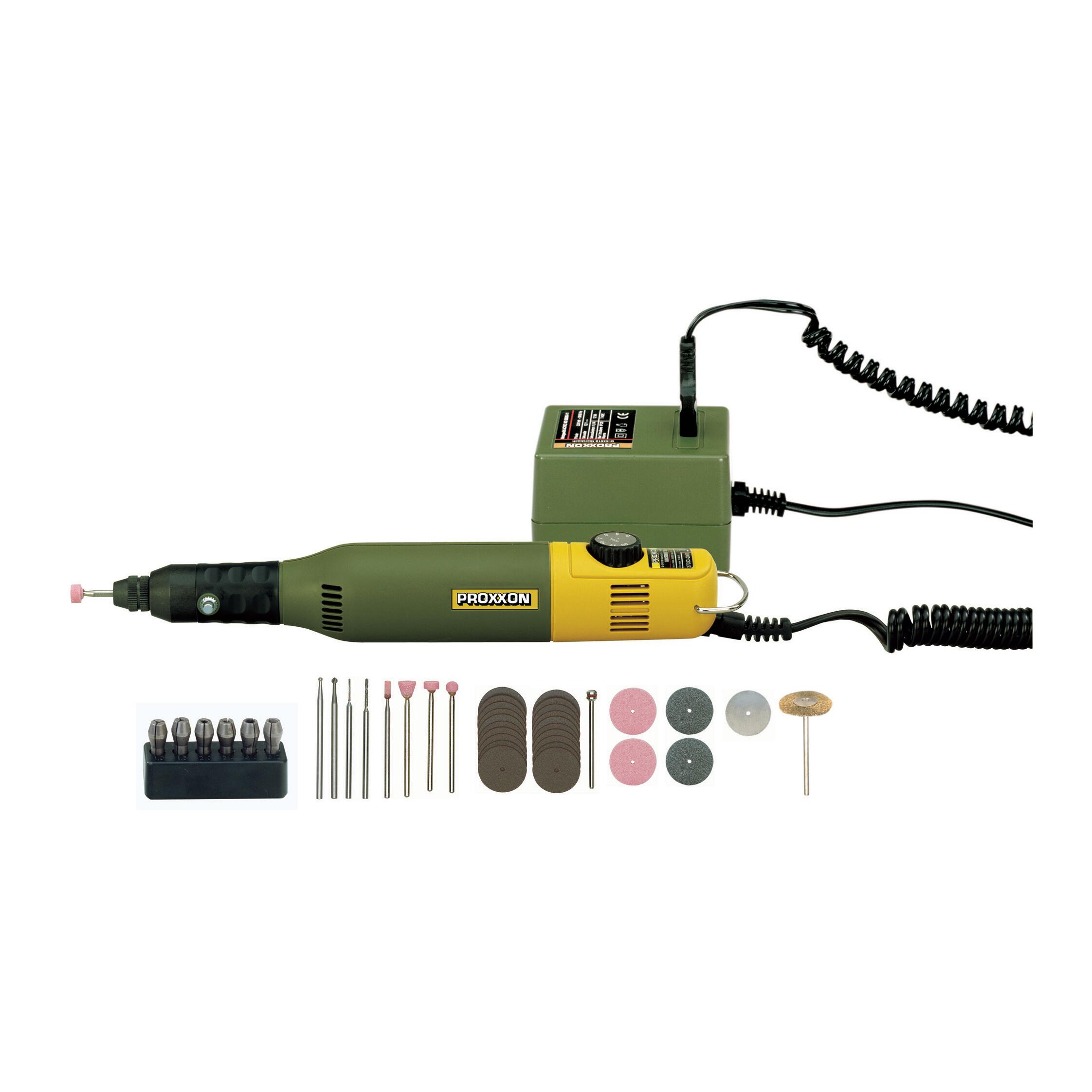 Potenza 40 W, voltaggio 12 V. Numero di giri da 5000 a 20000 giri/min. Peso 230 g. A collo lungo. con trasformatore e 34 utensili