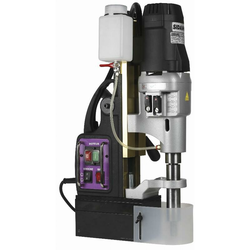 Dettagli: Trapano magnetico robusto e versatile Ingranaggi a 4 velocità Rotazione inversa per maschiatura da M3 a M14 Mandrino CM3 Schermo protettivo Base di rotazione laterale di 15° a sinistra e a destra Base di 20 mm in avanti/indietro Serbatoio del fluido da taglio integrato Lubrificazione dal centro dell'utensile