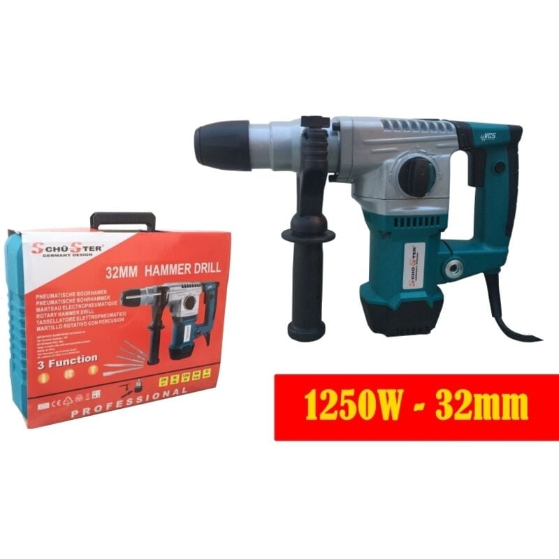 Funzione percussione per uso solo perforatore - Funzione rotazione solo per uso scalpellatore - Funzione combinata perforatore con percussione - Attacco SDS Plus a cambio rapido - Impugnatura supplementare orientabile - 1 Asta di profondit è - 1 Scalp