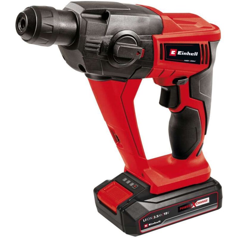 Martello perforatore a batteria Il martello perforatore a batteria TE-HD 18 Li Kit (1x2,5 Ah) è uno strumento robusto e versatile per avvitare e forare indipendentemente la rete, con una potente funzione martello aggiuntiva. Il meccanismo di impatto pneumatico consente un'ottima propulsione nella muratura e nel cemento. Grazie alla particolare forma dell'impugnatura ergonomica con impugnatura morbida, il trapano rimane sempre comodo e sicuro in mano. La pratica funzione di arresto rapido per evitare lo spostamento indesiderato degli utensili di perforazione e la brillante luce LED che illumina in modo ottimale l'area di lavoro offrono un maggiore comfort operativo. Inoltre, le punte per calcestruzzo standard possono essere cambiate rapidamente e senza utensili sul supporto automatico SDS-Plus. Il caricabatterie rapido in 30 minuti fornisce una ricarica rapida della potente batteria autonoma da 18 volt, che può essere utilizzata in molti altri dispositivi della famiglia Power X-Change.
