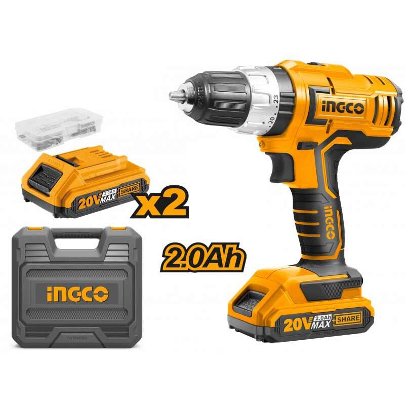 Trapano a percussione 20V Ingco CIDLI20031 Compatto e maneggevole, questo trapano si differenzia per la sua elevata coppia di serraggio e l'ottimo rapporto qualità prezzo. Dotato di funzione percussione e due batterie da 20V Ingco P20S Share. Principali caratteristiche: Funzione percussione. 2 Batterie 20V 2.0Ah in dotazione. Coppia massima: 55 Nm. Mandrino autoserrante da 2.0 a 13 mm. Regolazione coppia su 23 + 1 + 1 posizioni. Doppia velocita. Luce led integrata. 50 Accessori. Valigetta. Optional compatibili: Immagine Prodotto Capacità Batteria 20V 2.0 Ah 2.0 Ah Batteria 20V 4.0 Ah 4.0 Ah Batteria 20V 6.0 Ah 6.0 Ah Batteria 20V 7.5 Ah 7.5 Ah Caricabatterie Ingco 20V - Caricabatterie rapido Ingco Share