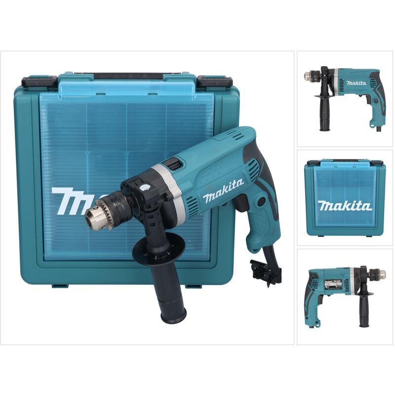 Contenuto della consegna: - 1x trapano a percussione Makita HP 1630 K - 1x impugnatura laterale - 1x supporto per chiave - 1x chiave per mandrino - 1x mandrino a corona dentata - 1x valigetta Makita Descrizione del prodotto: Il trapano a percussione Makita HP 1630 è uno strumento potente con un motore da 710 watt, perfetto per lavori di foratura, percussione e avvitamento. La scatola ingranaggi in alluminio e l'alloggiamento cilindrico del motore rendono questo trapano a percussione estremamente robusto e durevole, consentendogli di resistere alle esigenze più difficili. Il controllo elettronico e il blocco per il funzionamento a destra e a sinistra assicurano un controllo preciso della macchina. Il funzionamento continuo non è un problema, grazie al sistema di bloccaggio. L'impugnatura antiscivolo con imbottitura in gomma garantisce una presa salda e confortevole durante l'uso. Il mandrino a corona dentata consente di cambiare punte e trapani in modo semplice e veloce. Specifiche