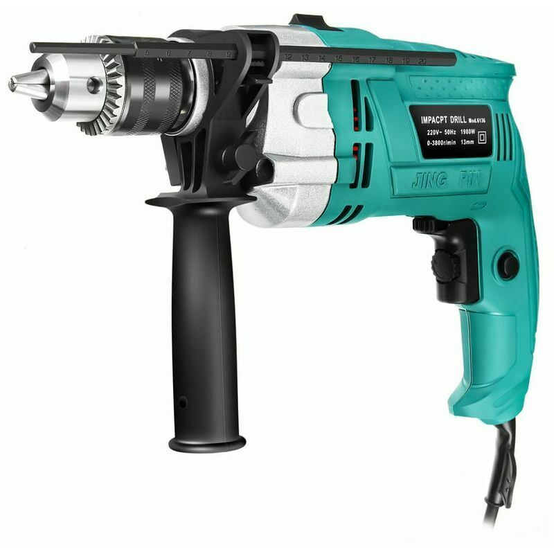 Caratteristiche: Tensione: 220 V Potenza: 1980 W Frequenza nominale: 50/60 Hz Velocità a vuoto: 0-3800 giri/min Mandrino: 13 mm Funzione: funzione trapano piatto, funzione impatto Spina: spina EU (forniremo adattatore a seconda del paese di consegna) Funzionalità - Il potente motore offre fino al 1980 W e velocità di 3800 giri/min - Mandrino da 1,5 a 13 mm per una sostituzione rapida e semplice della punta - Regolazione precisa della velocità, migliore controllo durante l'avvitamento di una vite - Design di contatto ad ampia area, uscita di corrente stabile, ventola di raffreddamento - Facile passaggio tra modalità avanti/indietro e modalità blocco sicuro - Con funzione trapano piatto e funzione impatto - Circuito in gomma, antipolvere, impermeabile e antiurto. - Ergonomico non- la maniglia antiscivolo offre comfort e controllo Dotazione: 1 trapano a percussione elettrico 1 scala di misurazione della profondità 1 chiave inglese 1 manubrio