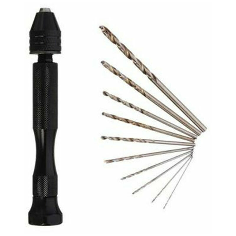 Trapano manuale in acciaio legato per perforazione di precisione a turbina, trapano manuale semiautomatico, preciso ed efficiente, risparmio di tempo e fatica, comodo e veloce. Mini punte elicoidali in acciaio veloci, è possibile una varietà di dimensioni selezionato. (0,8 / 1,0 / 1,2 / 1,5 / 1,8 / 2,0 / 2,2 / 2,5 / 2,8 / 3,0 mm) Adatto per assemblaggio elettronico, creazione di utensili, creazione di modelli, scrittura, artigianato e hobby. Nota: questo è uno strumento manuale e non è uno strumento elettrico. Le punte elicoidali non possono adattarsi a elementi duri come acciaio e pietra. Adatto per forare legno, plastica, gomma, PVC, dadi, modelli, ossa, corna, ambra, olive e altri materiali, piuttosto che acciaio, ferro, pietra dura. Quantità di consegna: 1 pz/set (trapano a spirale manuale nero + 10 punte a spirale).