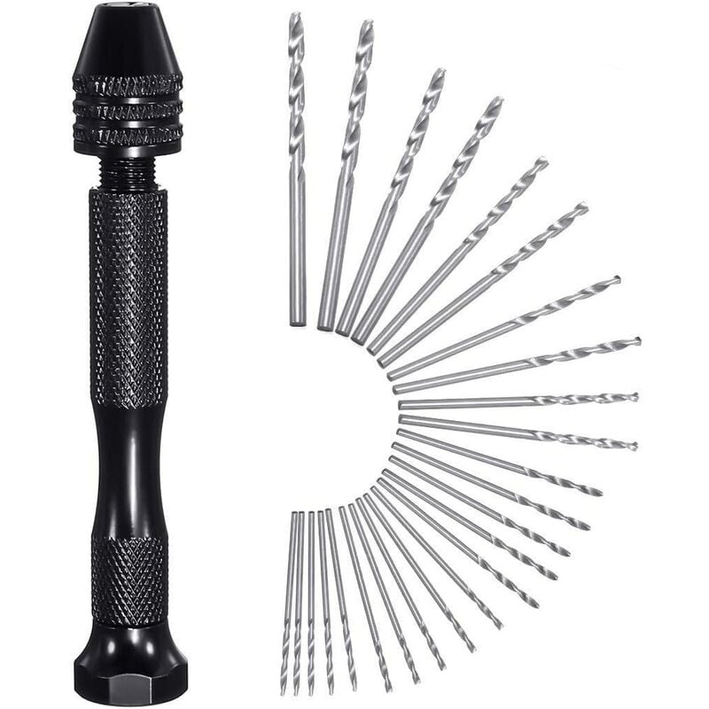 Set da 26 pezzi: un mini manico e 25 pezzi di punte da trapano di diverse dimensioni possono soddisfare le diverse esigenze, tra cui 0,5 mm/0,6 mm/1,0 mm/1,2 mm/1,5 mm/1,8 mm/2,0 mm/2,35 mm Alta qualità: il trapano a mano è realizzato in lega di alluminio nera con impugnatura antiscivolo, mentre la punta da trapano da 25 pezzi è realizzata in acciaio ad alta velocità per garantire che questo trapano sia pronto per tutti gli hobby e la precisione lavoro che puoi dedicarci e gestire le tue costruzioni di precisione. Trapano manuale regolabile: 3 pinze in acciaio temprato con artiglio, che possono essere equipaggiate con punte di diverse dimensioni, comprese punte da 0,3 mm a 3,4 mm di diametro. Il filo di tensione (filetto interno) si adatta perfettamente al metallo sottostante e rimane stabile. Il materiale metallico lo rende resistente per un uso a lungo termine. Dopo diverse volte, il trapano non scivolerà o cadrà. Trapano a mano versatile: il set di trapano a mano può essere