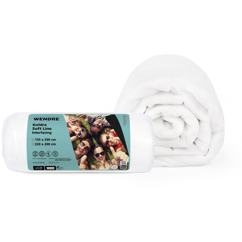 Trapunta in tessuto non tessuto, Misura: 200x220 cm. Trapuntatura: canali. Tipologia: estiva. Finitura: tagliacuci. Rivestimento: 100% polipropilene, 40 g/m². Imbottitura del piumino: 100% fibra HCS riciclata, 130 g/m². Imballo: in busta LDPE stampata. Prodotto polacco.