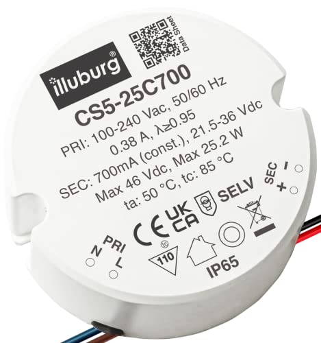 Alimentatore LED CS5-25C700: ingresso 100-240V (AC), uscita 700mA corrente sonora con range di tensione 21,5-36V (DC), non dimmerabile, installazione a incasso.