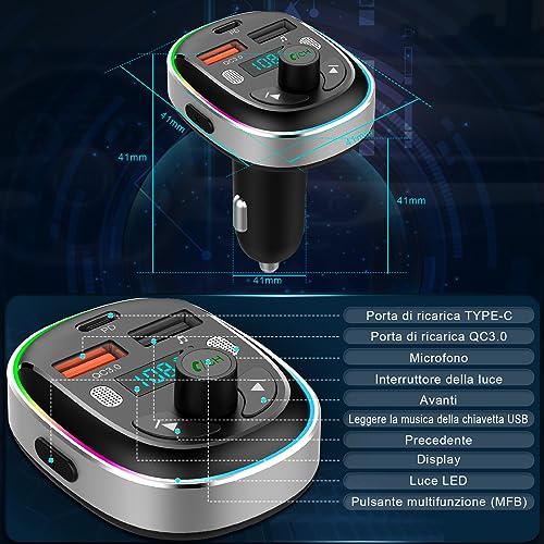 【Porte USB PD30W QC3,0 & Tipo-C】Il trasmettitore FM Bluetooth è dotato di due porte USB e di una porta Type-C, che consentono di ricaricare fino a 3 dispositivi contemporaneamente e di ricaricare fino a 4 volte più velocemente rispetto ai caricatori standard, in modo da poter godere di un'esperienza di ricarica rapidissima durante la guid